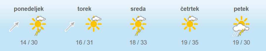 Popoldne in zvečer je predvsem v severnih krajih možna kakšna vročinska nevihta. Ponekod bo pihal jugozahodni veter. Najvišje dnevne temperature bodo od 27 do 31 stopinj Celzija.
