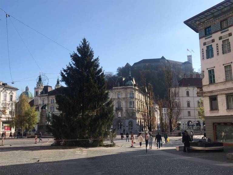 Na Prešernovem trgu že stoji glavna božična atrakcija: 18 metrov visoka, štiri tone težka in 35 let stara smreka. Letos smreke niso poimenovali, jo pa poklanjajo vsem zdravstvenim delavcem.