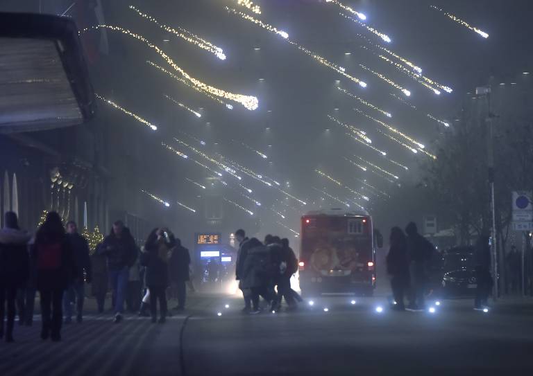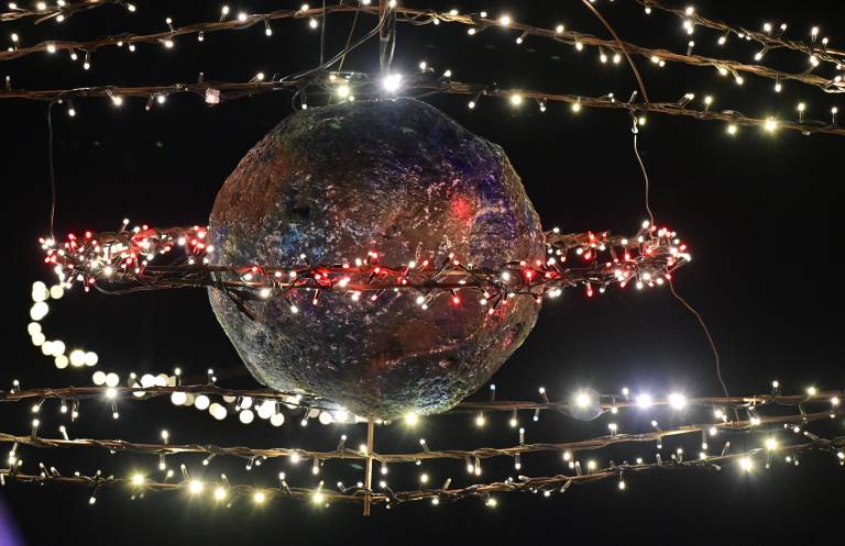 Na začetku Trubarjeve je mogoče opaziti skupino kozmičnih popotnikov, ki si s svojimi letečimi krožniki iz recikliranih materialov ter na brezogljični pogon ogledujejo novoletno Ljubljano.