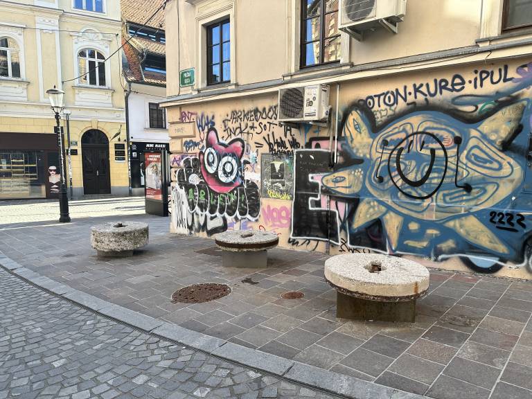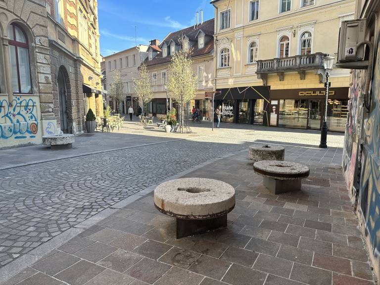 Namesto običajnih klopi so sprehajalci s prenovo Trbuarjeve ulice tam dobili različno velike mlinske kamne.