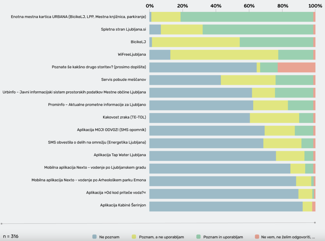 Raziskava med meščani je pokazala, da je velik del anketiranih seznanjen s kartico Urbana, sistemom BicikeLJ in brezplačnim dostopom do spleta prek t. i. »WiFreeLjubljana«, vendar samo manjši delež dejansko uporablja te storitve.