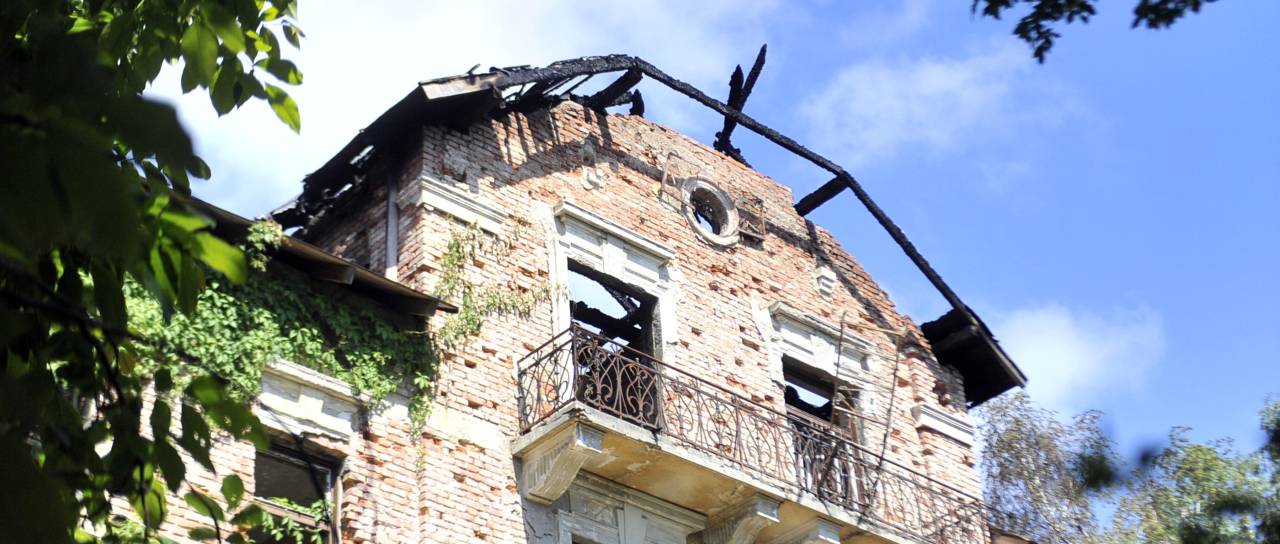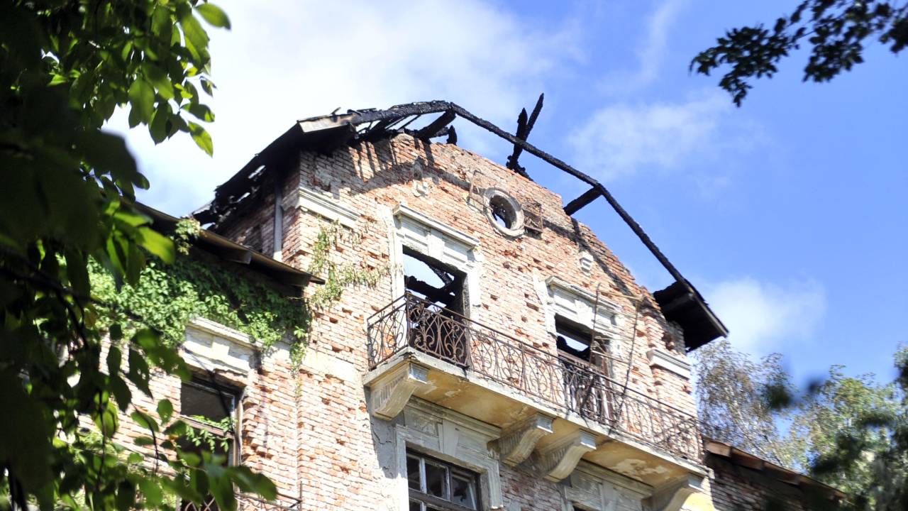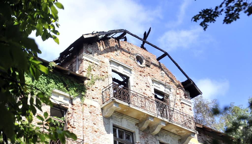 Streha je uničena, vidi se, da je tam bilo že več požarov, naokoli je polno smeti in ruševin.