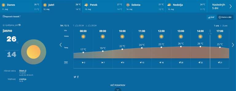 Pihal bo jugozahodni veter. Najnižje jutranje temperature bodo od 8 do 13, najvišje dnevne od 24 do 29 stopinj Celzija.