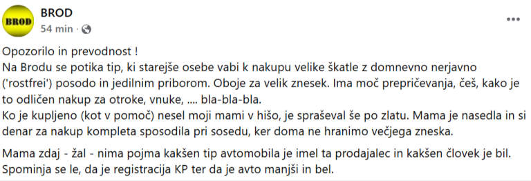 »Starejše osebe vabi k nakupu velike škatle z domnevno nerjavečo posodo in jedilnim priborom. Oboje ponuja za visok znesek. Je zelo prepričljiv, govori, kako je to odlična naložba za otroke, vnuke … bla, bla, bla,« je današnje dopoldansko dogajanje opisal avtor objave.