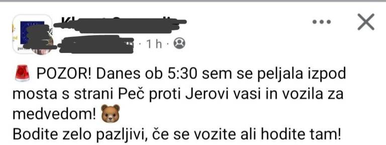 Le nekaj dni kasneje pa ponovno poročamo o srečanju z medvedom. Tokrat na območju Grosuplja. Na družbenih omrežjih je namreč danes zjutraj zaokrožil zapis, da naj bi ženska v bližini Jerove vasi ob 5.30 zjutraj vozila za medvedom, ki je hodil po cesti.