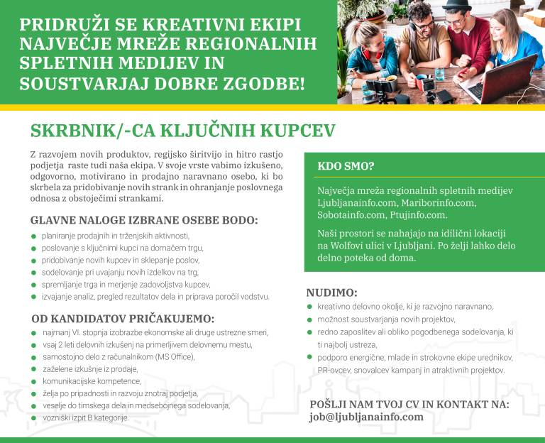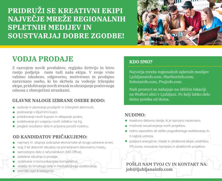 Tokrat v svoje vrste vabimo dva nova sodelavca oziroma sodelavki, in sicer vodjo prodaje in skrbnika ali skrbnico ključnih kupcev.
