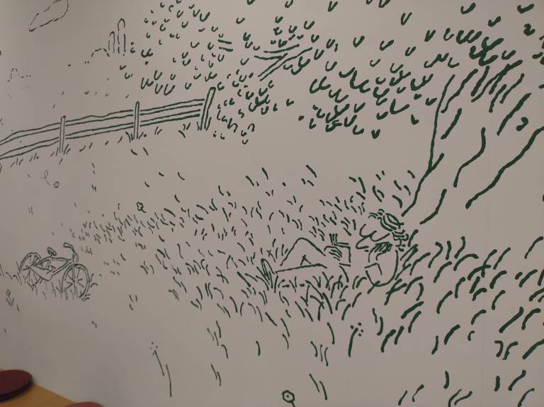 Tam nas na steni pozdravi travnik z drevesi. Pod drevesom je zleknjen moški, ki bere knjigo, vidimo še kolo v travi – vendarle smo v nekdanji tovarni koles Rog, pojasni avtor poslikave.