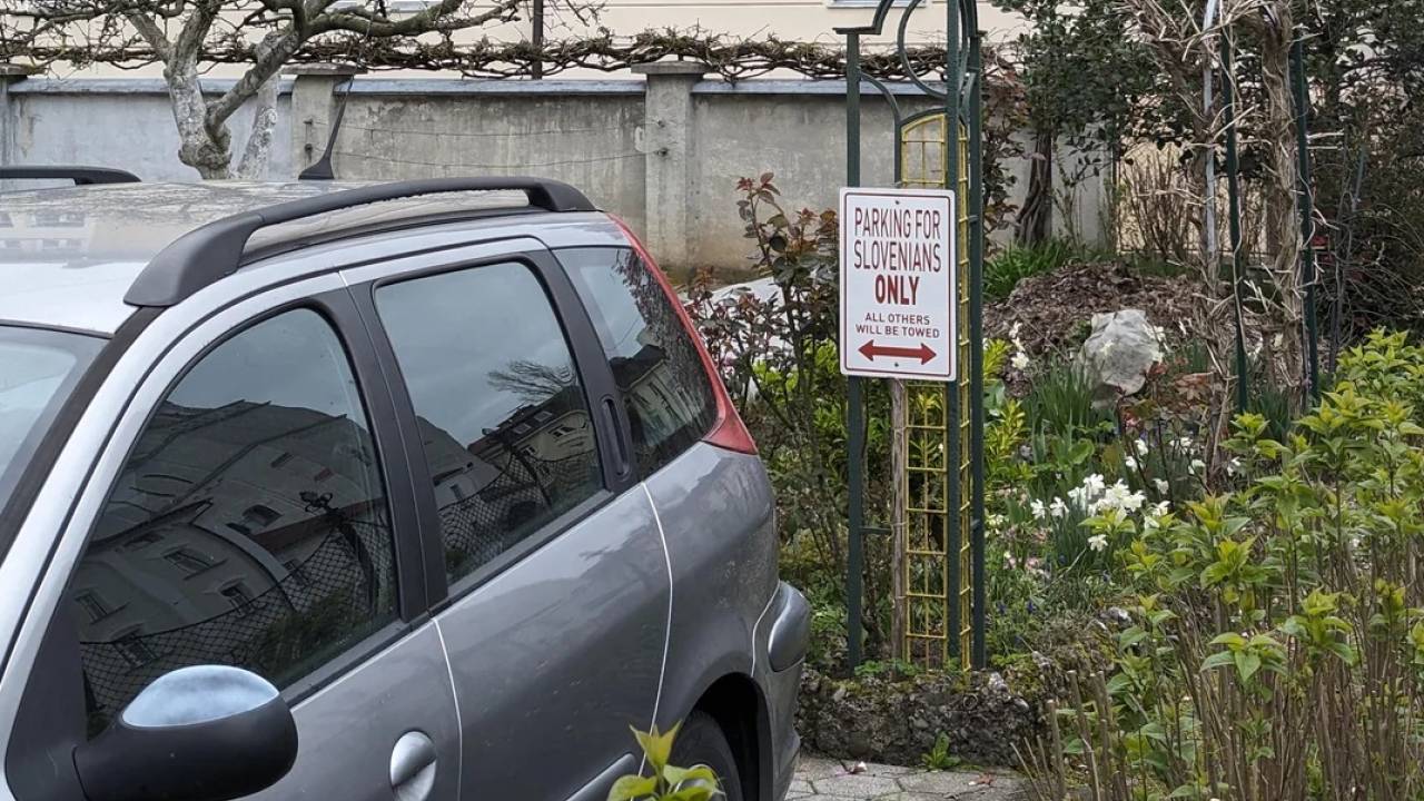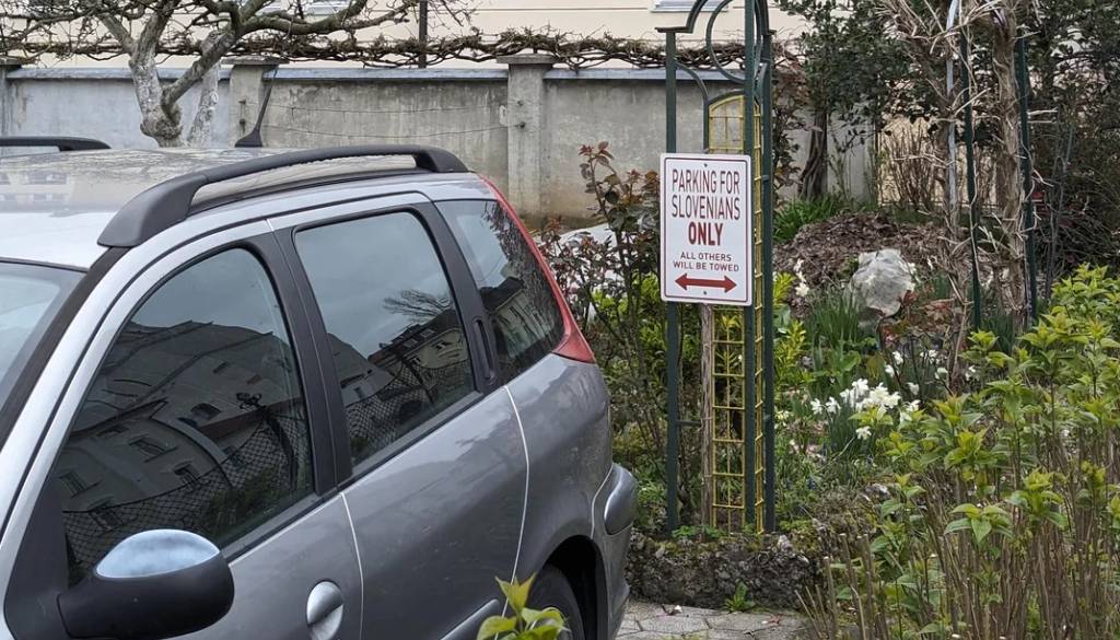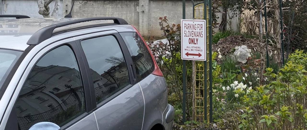 Na ulici Stare Pravde v Ljubljani je bila opažena tabla, ki sporoča, da je parkiranje na zasebnem dvorišču dovoljeno le Slovencem - po vozila vseh ostalih bo prišel pajek, še piše na njej. V angleščini.