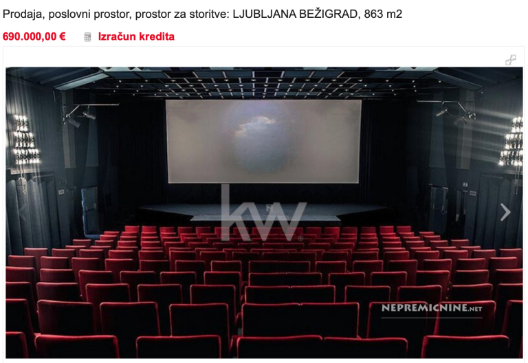 Na spletu se je pojavil oglas za »poslovni prostor za storitve«, lokacija Bežigrad. Nepremičnina, ki meri 853 kvadratnih metrov, je lahko vaša za 690 tisoč evrov. Gre za prostore, v katerih se nahaja legendarni ljubljanski kino Bežigrad.