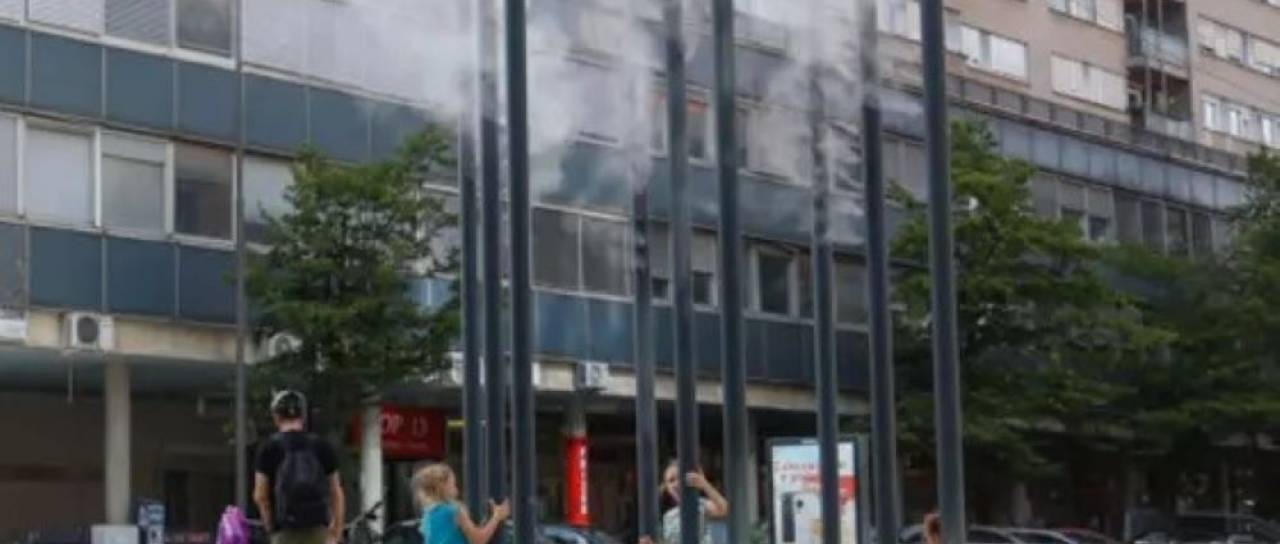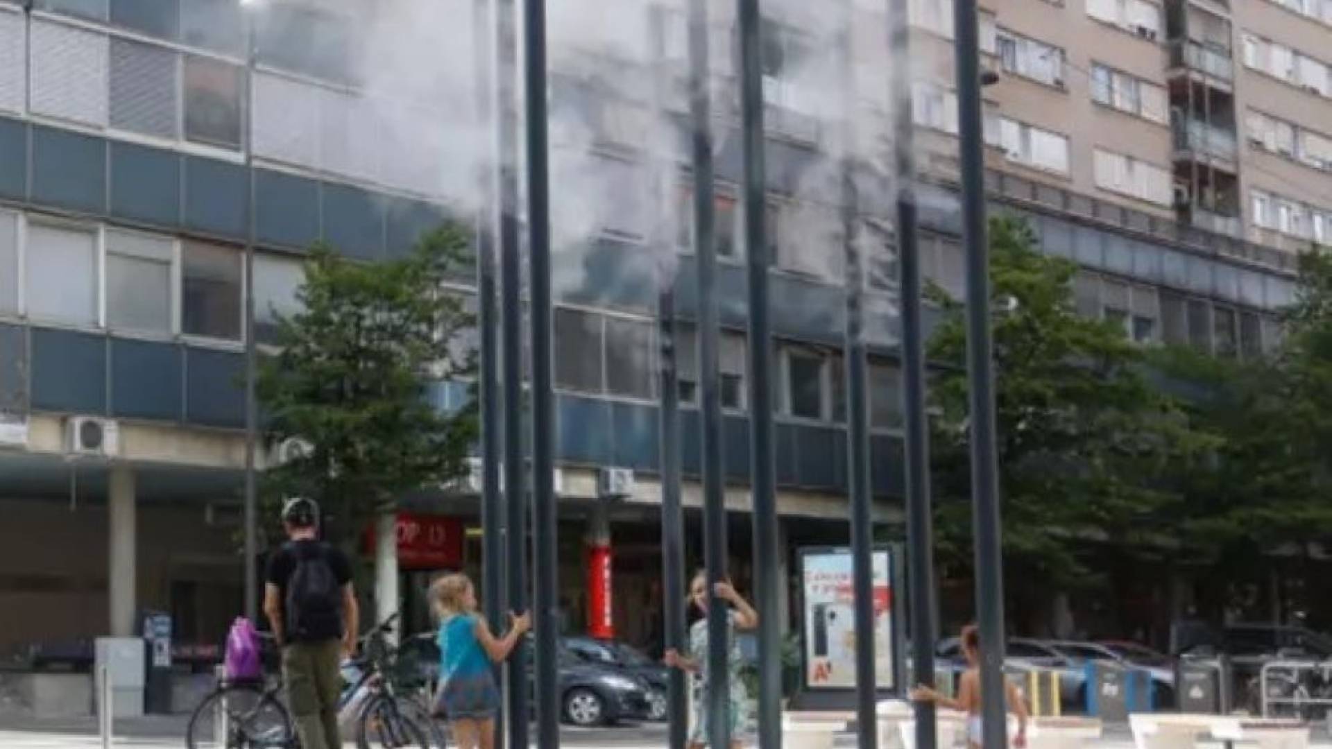 Ob vodni fontani oziroma pršilnikih, ki so nameščeni na Čufarjevi ulici, med stavbo RTV Slovenija in novozgrajenim hotelom, je ob vročih dneh kar gneča.