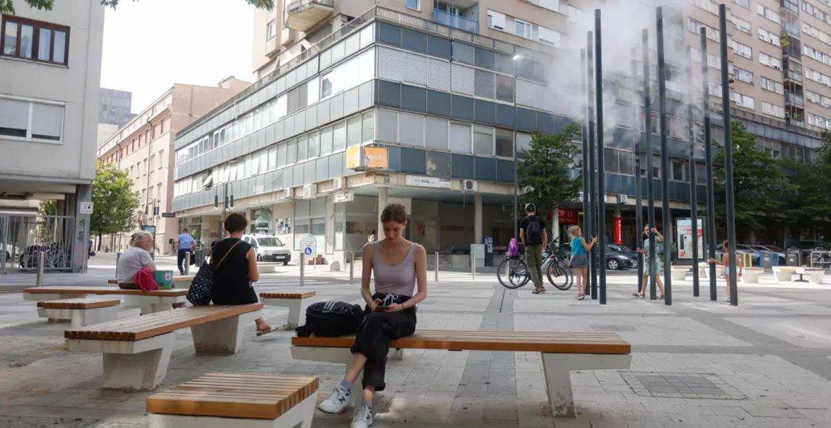 V vročih dneh Ljubljana ponuja kar nekaj mest, kjer se lahko prijetno ohladite, eno izmed njih je tudi okoli visokih drogov oziroma pršilnikov na obnovljenem delu Čufarjeve ulice. Tam namreč pršilniki ustvarjajo hladno vodno meglico.