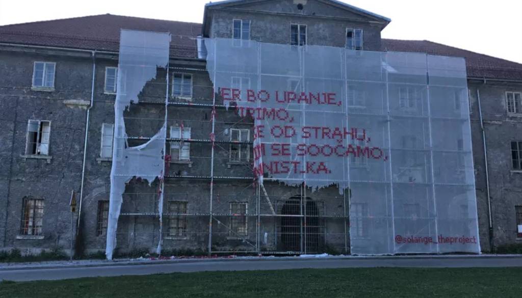 Umetniško delo z napisom »Dokler bo upanje, ki ga širimo, močnejše od strahu, s katerim se soočamo, bom feminist_ka.« je bilo na pročelje Palače Cukrarna nameščeno v petek, 30. aprila, ob odprtju razstave Ko gesta postane dogodek v Mestni galeriji Ljubljana.