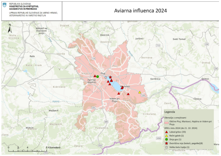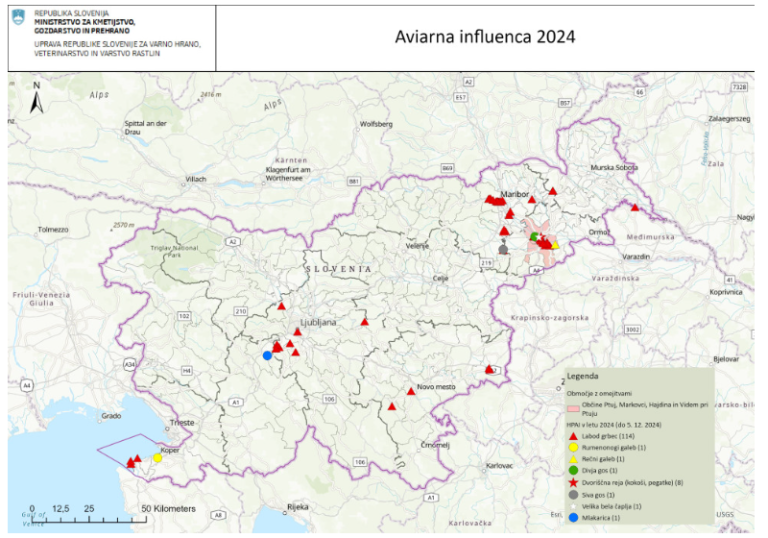 Visoko patogena aviarna influenca podtipa H5N1 se je tudi letos pojavila pri prostoživečih pticah v Sloveniji, in sicer so to vrste labod grbec, divja gos, rečni galeb, velika bela čaplja, siva gos, rumenonogi galeb, mlakarica.