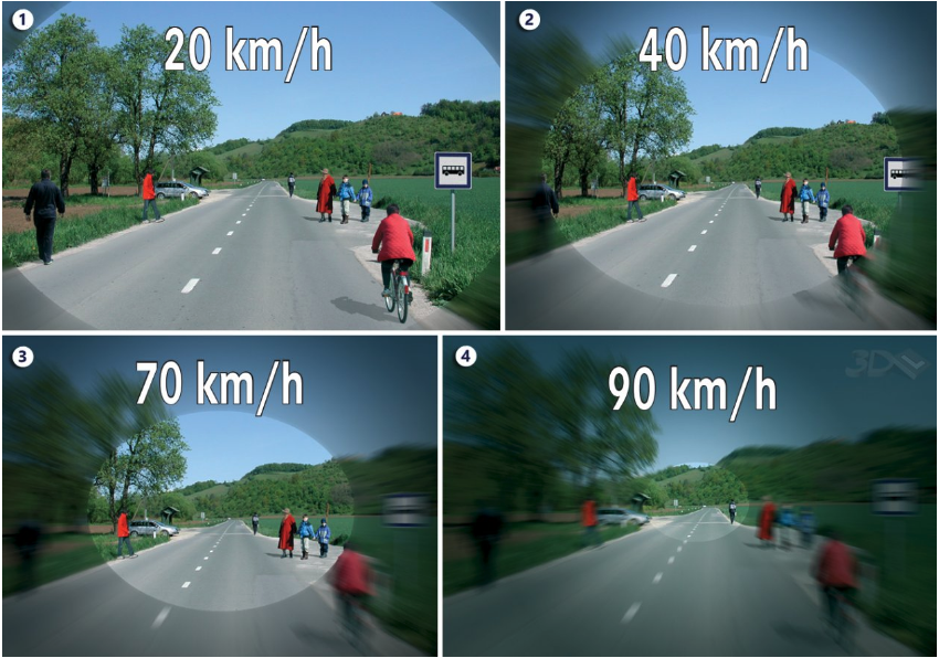 Med vožnjo je potrebno zaznati čim več podrobnosti na cesti in okrog nje. S povečanjem hitrosti se voznikovo vidno polje zožuje. To privede do tako imenovanega tunelskega vida.