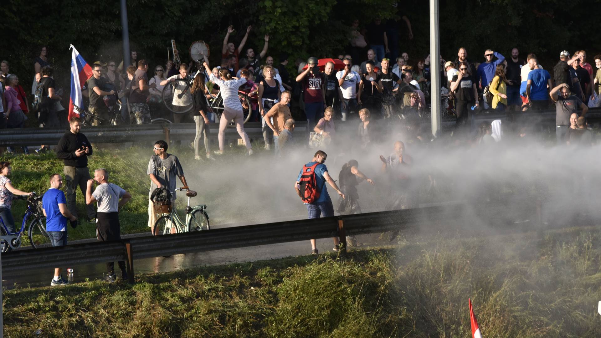 17.13 - Policisti z vodnim topom preganjajo protestnike z ljubljanske obvoznice obe smeri.