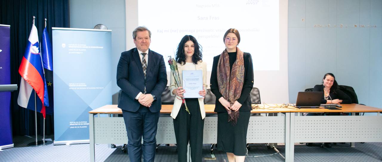 Sara Fras iz Ljubljane je prejela nagrado Mladinskega sveta Slovenije za najboljše diplomsko delo s področja mladih za delo z naslovom Kaj mi (ne) pomaga preživeti: vračanje k uporabniški perspektivi.