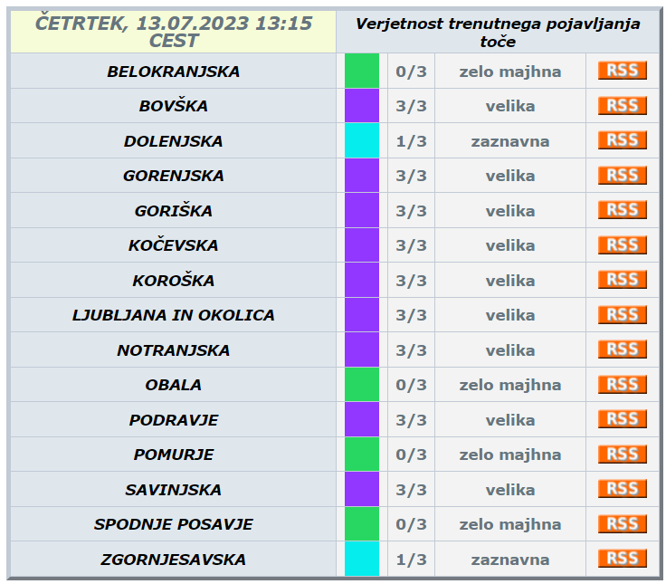 Agencija Republike Slovenije za okolje je za Bovško, Gorenjsko, Goriško, Kočevsko, Koroško, Notranjsko, Podravje, Savinjsko in Ljubljano z okolico izdala vijoličasto opozorilo za veliko verjetnost trenutnega pojavljanja toče.