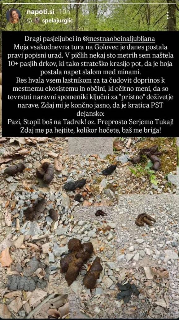 Na družbenih omrežjih je odmevala objava Špele Jurglič, slovenske strokovnjakinje za komuniciranje in nekdanje televizijske novinarke, ki je med sprehodom po Golovcu opozorila na množico pasjih iztrebkov.