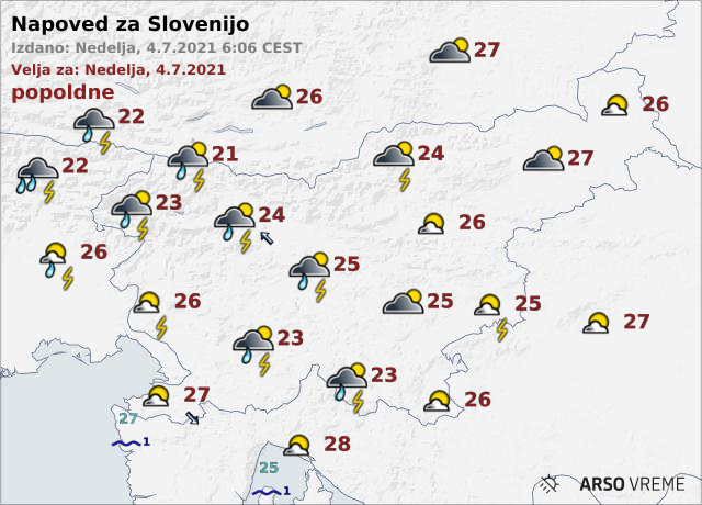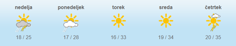 Jutri zjutraj ali zgodaj dopoldne bodo padavine ponehale in od zahoda se bo zjasnilo. Čez dan bo možna še kakšna manjša ploha. Najvišje dnevne temperature bodo od 25 do 30 stopinj Celzija.