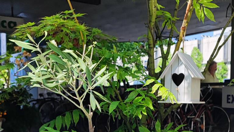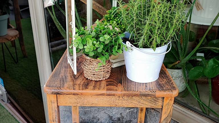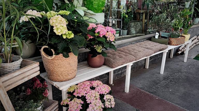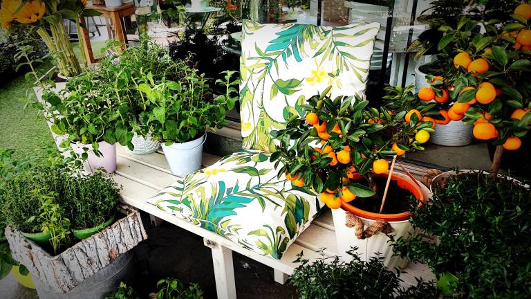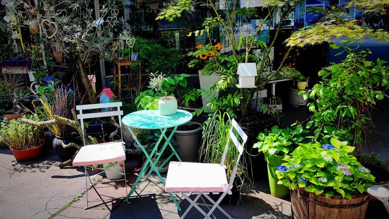 Zraven stojijo miza s stoli, podaljšek cvetličarne pa se tu še ne konča, saj zunanjo okolico prodajnega prostora lepšajo številne lončnice z manjšimi drevesi, grmi in cvetličnimi zasaditvami.