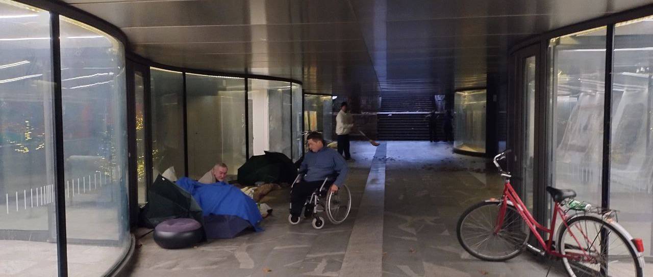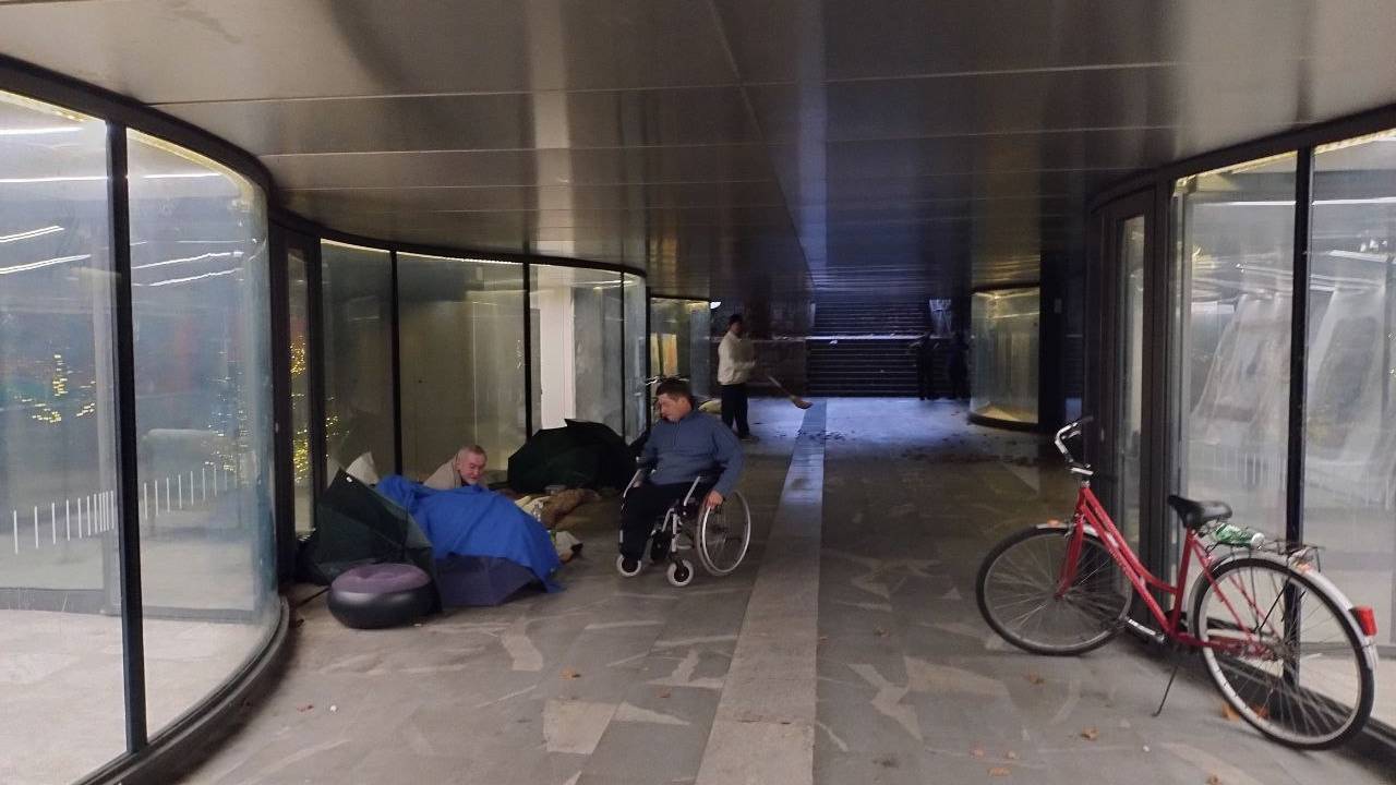 Po tleh ležijo pobruhane in pourinirane vzmetnice, vzglavniki in spalne vreče, steklenice s pijačo in torbe. Brezdomci so me začudeno gledali, eden reče: »Kaj počneš tukaj, tukaj nimaš kaj delati!«
