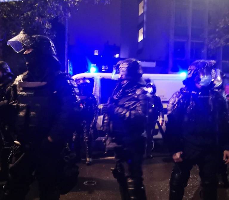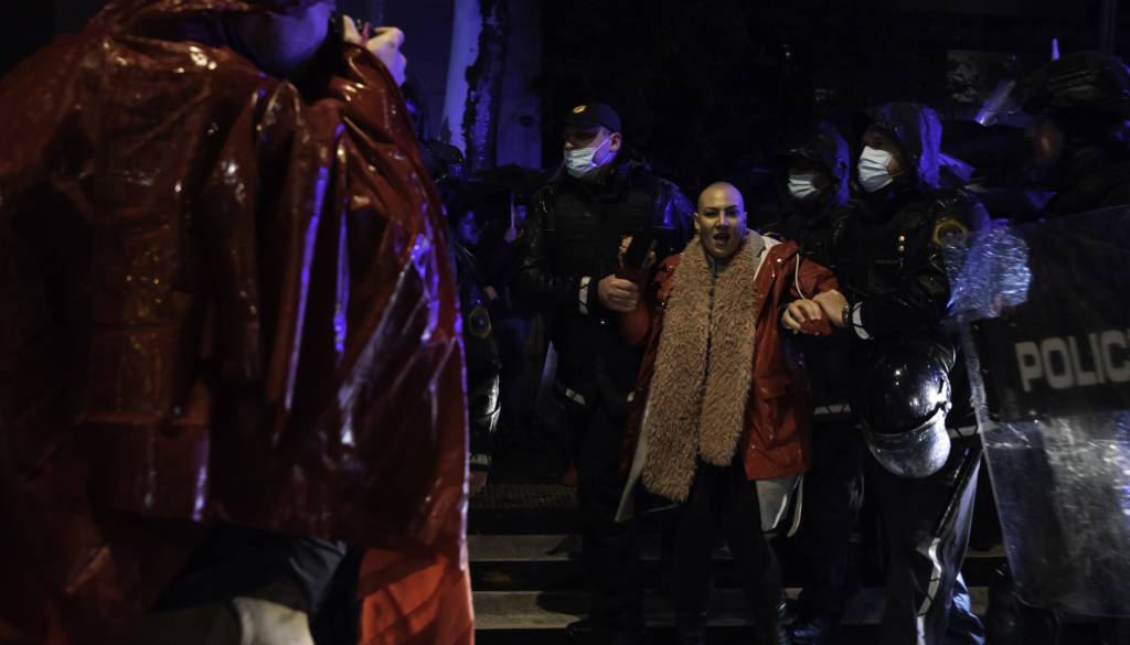 18.15 - Protestniki stojijo okrog policijskega vozila, v katerem sta prijeta protestnika. Kričijo na policiste, ki so obkolili vozilo.