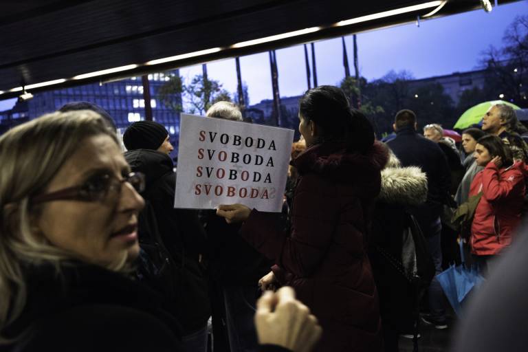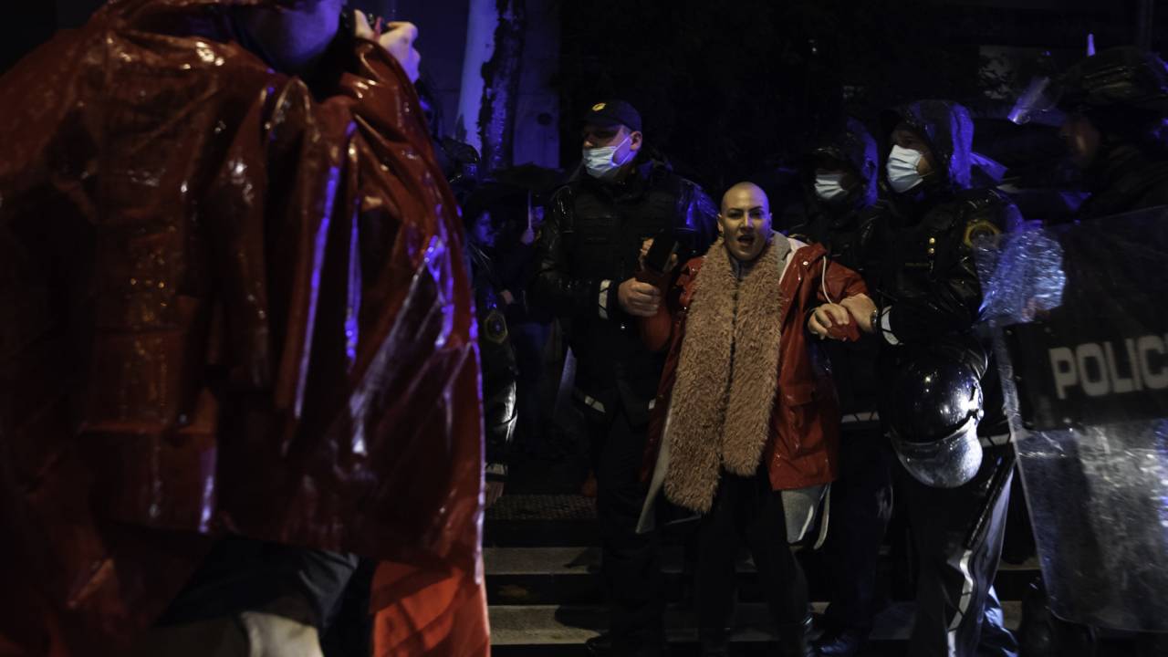 18.20 - Policijsko vozilo s prijetima protestnikoma je odpeljalo iz središča mesta. Protestniki glasno žvižgajo.