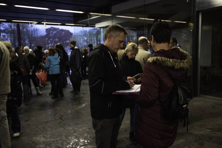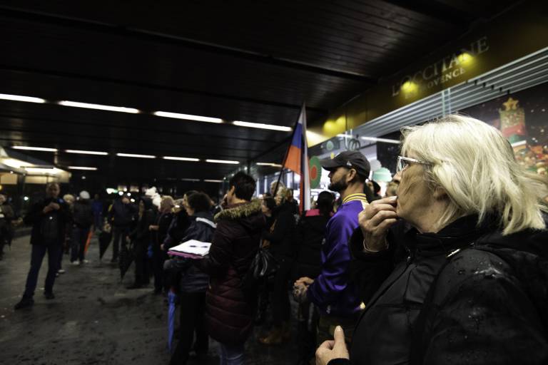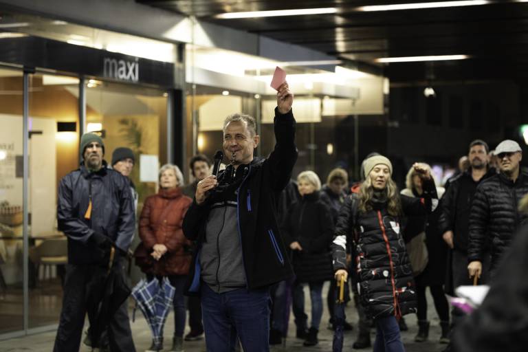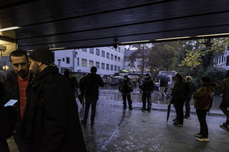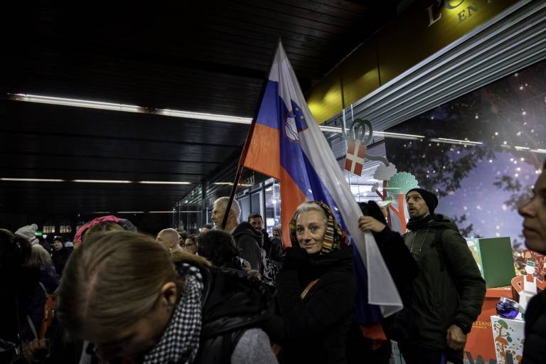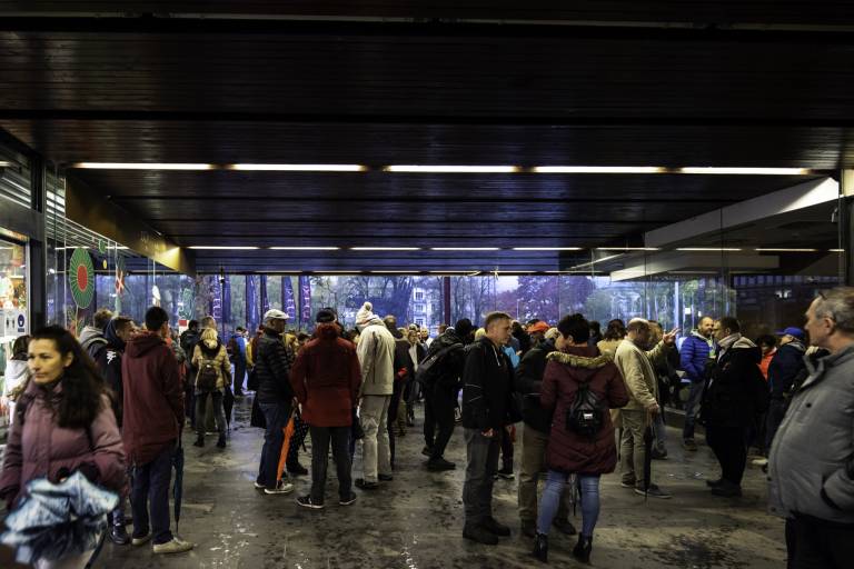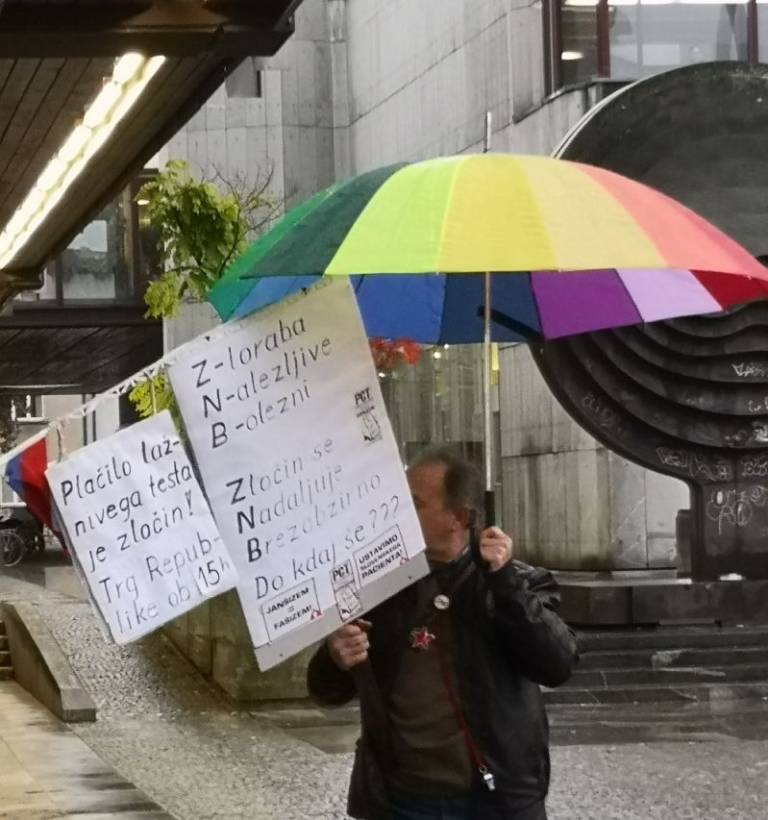 16.00 - Nekaj protestnikov se je zbralo pod streho pred veleblagovnico Maxi ob Trgu republike. Ta je zaradi dežja povsem prazen.
