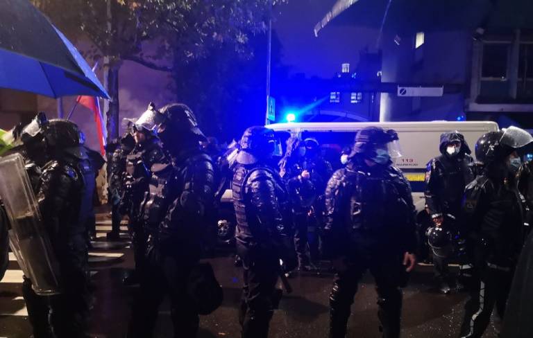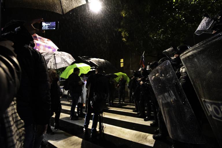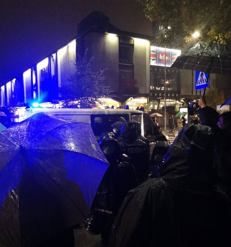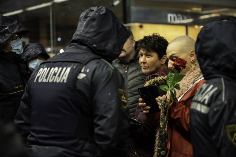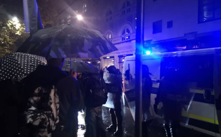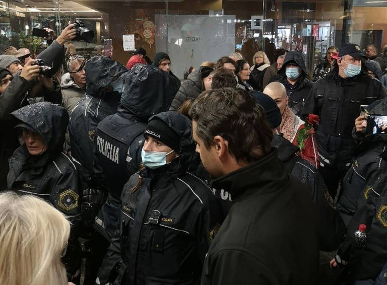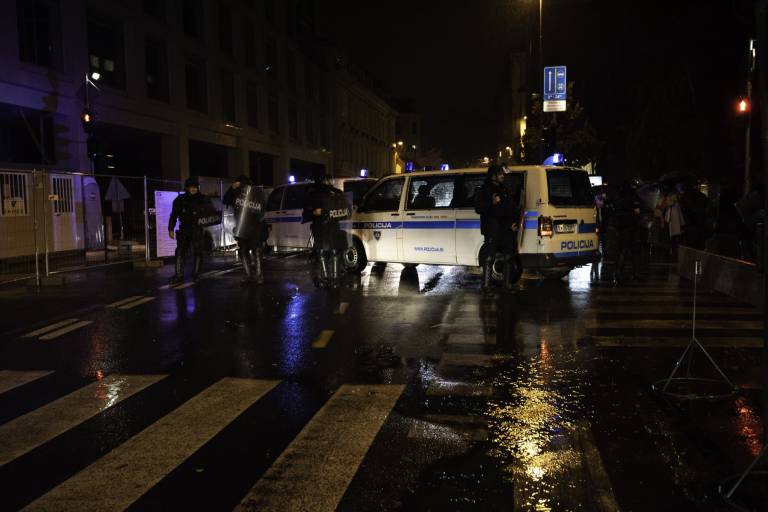 17.45 - Po vsem središču mesta so postavljene policijske blokade, zato so se protestniki vrnili pod streho ob Trgu republike.
