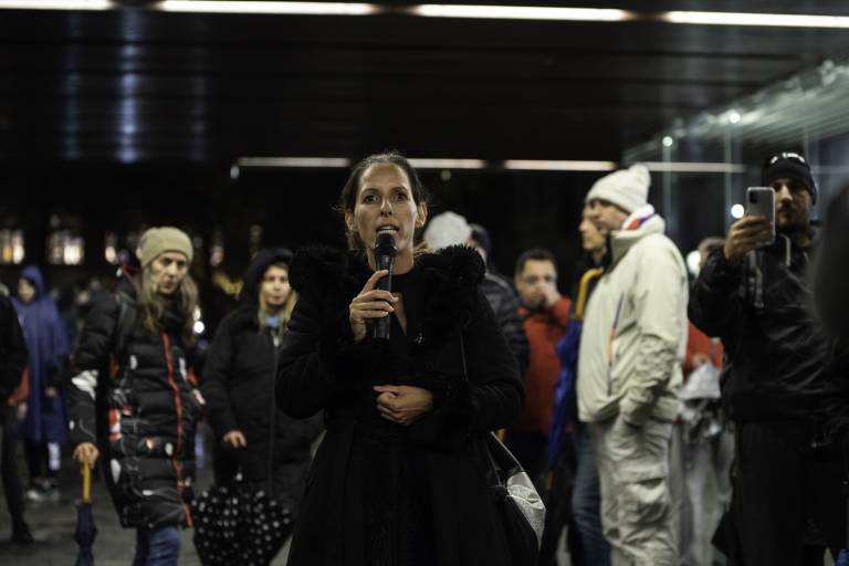 16.30 - Protestniki tudi ta teden nadaljujejo z govori. Zbralo se jih je nekaj sto. Policiste pozivajo, naj začnejo preganjati »pravi kriminal« v državi.