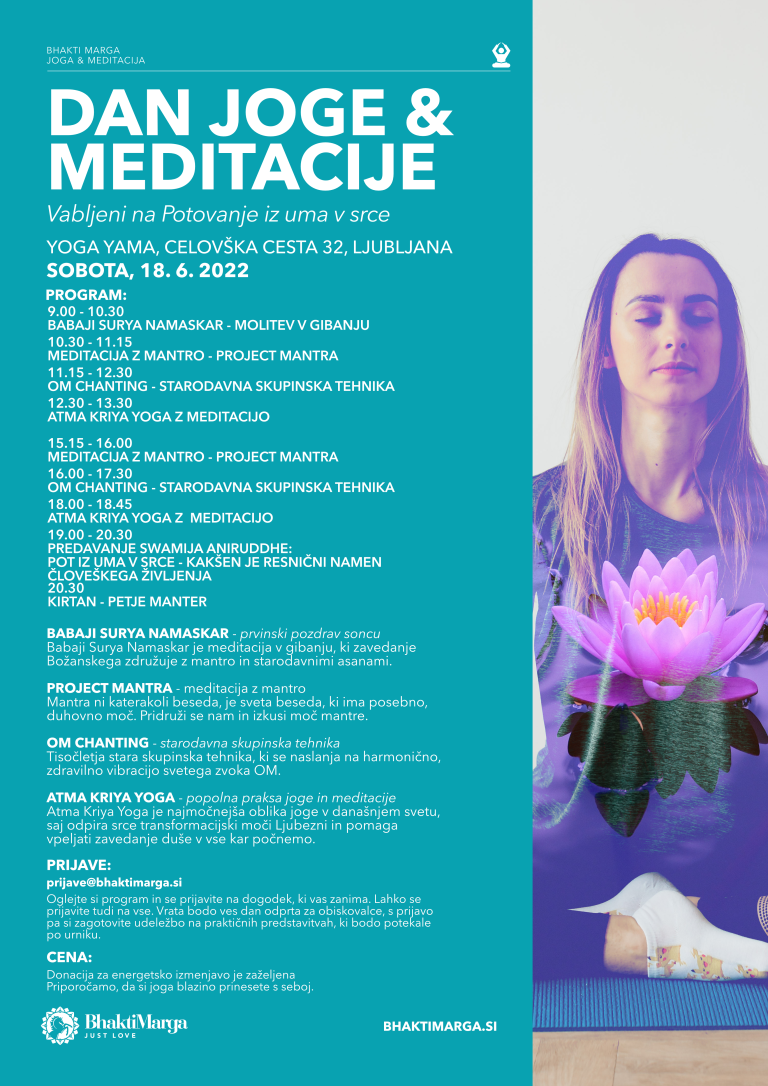 21. junija obeležujemo svetovni dan joge. V Yoga Yama studiu v Ljubljani ga bodo nekaj dni prej počastili s praktično predstavitvijo jogijskih in meditacijskih tehnik, ki jih prakticirajo in učijo v duhovni organizaciji Bhakti Marga.