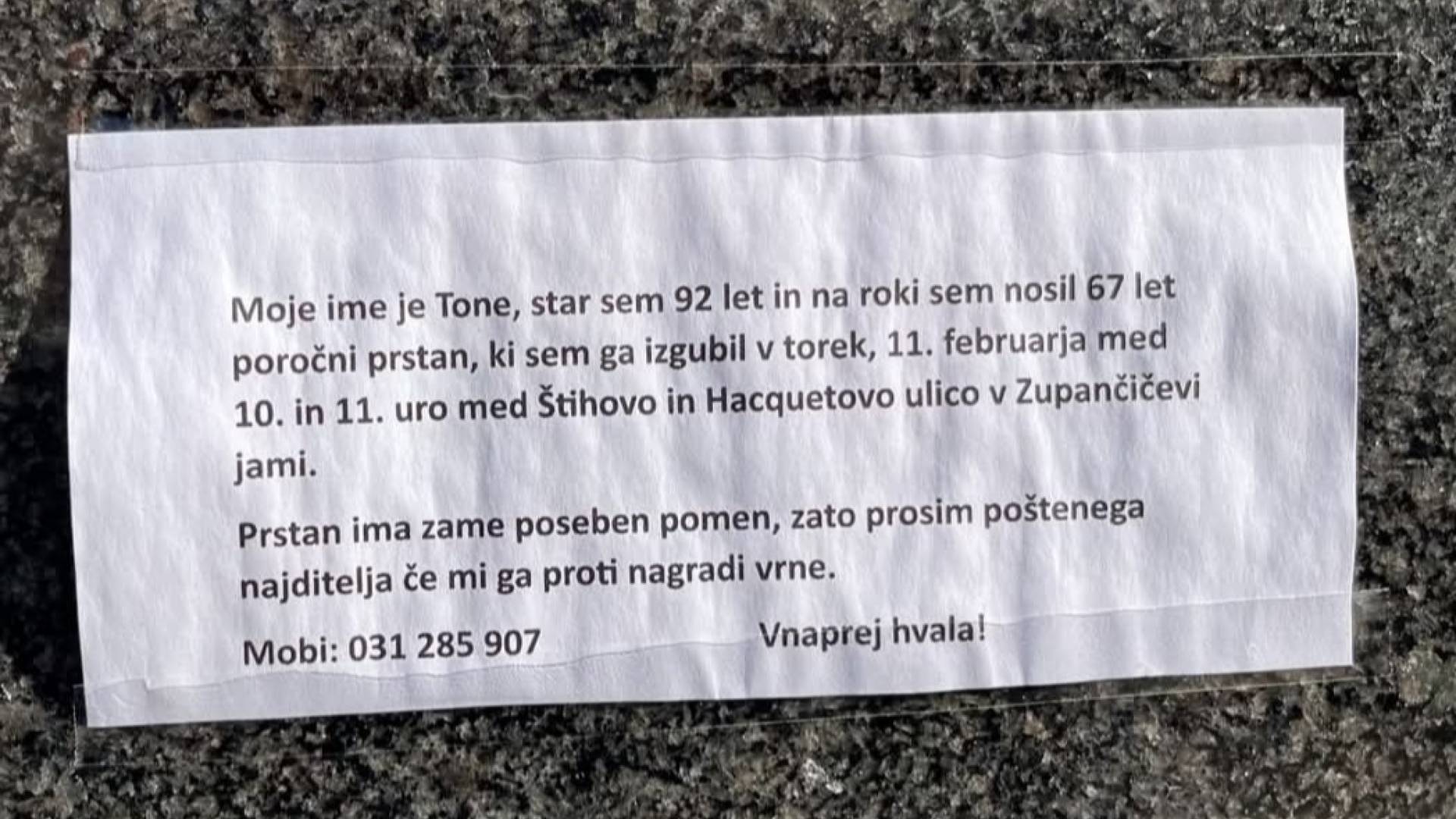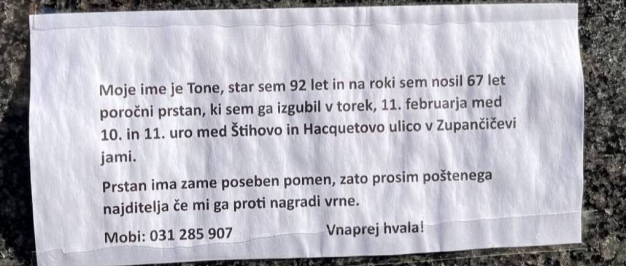 »Moje ime je Tone, star sem 92 let in na roki sem nosil 67 let poročni prstan, ki sem ga izgubil. Ta prstan mi pomeni vse, zato prosim poštenega najditelja, če mi ga vrne. Vnaprej hvala,« je zapisal v svoji iskreni prošnji.