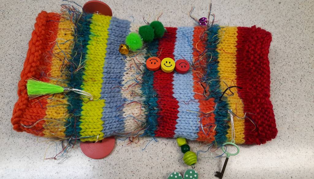 Take pletene rokavčke najprej spletemo v zanimivih barvah, nato pa nanje našijemo različne predmete. Predmeti morajo biti dobro pritrjeni, da jih starejši ljudje ne potrgajo.