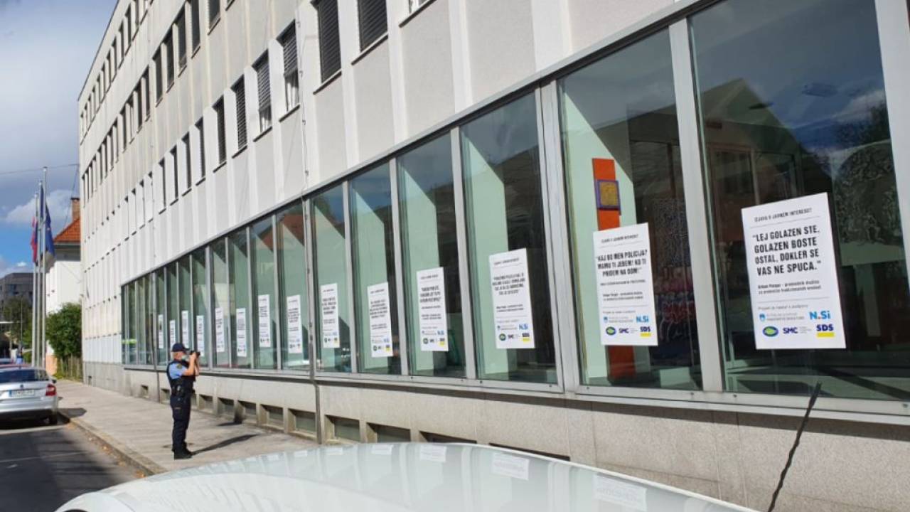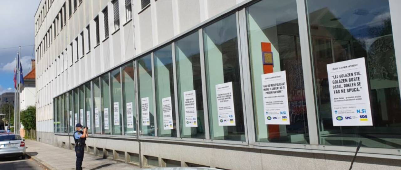 Na okna stavbe ministrstva so prilepili plakate, na katerih so Purgarjevi citati, nad njimi pa zapis: Izjava v javnem interesu?