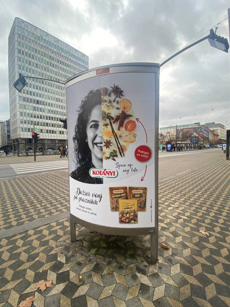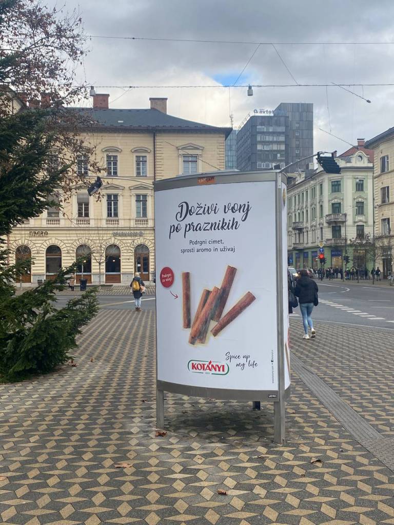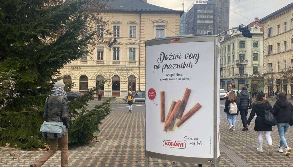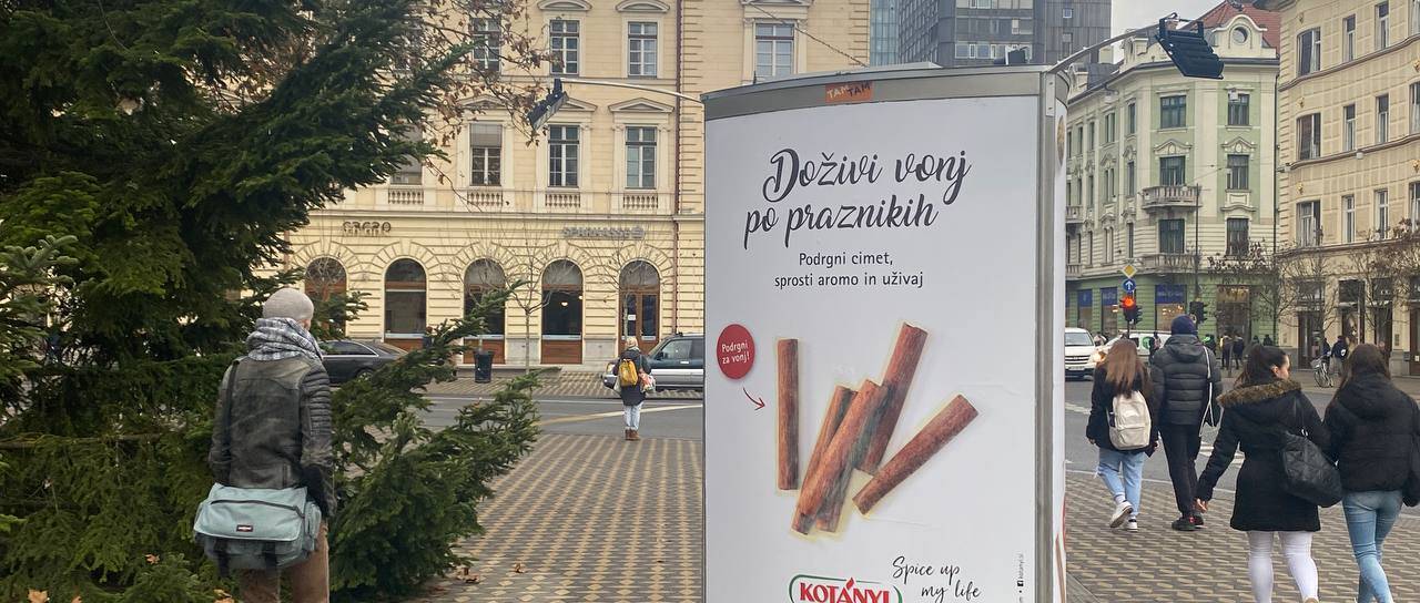 V centru Ljubljane smo naleteli na nekaj plakatov s praznično noto: oglašujejo začimbe, ki jih tradicionalno povezujemo z božičem, denimo cimet in aromo medenjakov.