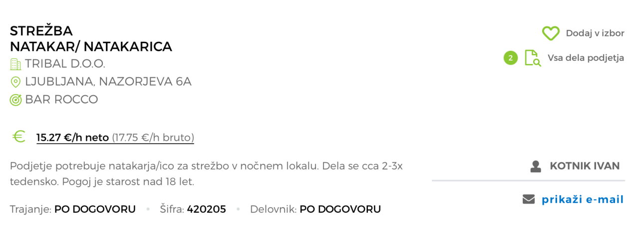 »Podjetje potrebuje natakarja/ico za strežbo v nočnem lokalu. Dela se cca. dvakrat do trikrat tedensko. Pogoj je starost nad 18 let,« lahko preberemo v oglasu.