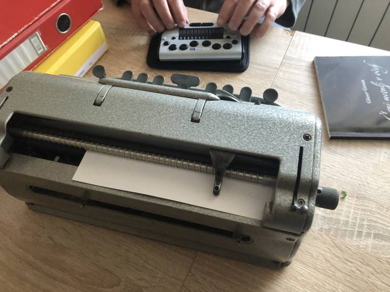 »V sodobnem času pa imamo takšne Brajeve vrstice, ki jih lahko priklopiš na računalnik ali pa tudi samostojno. Ker je mala, jo lahko imaš v žepu, pa si kjerkoli kaj zapišeš,« nam pokaže Goran.