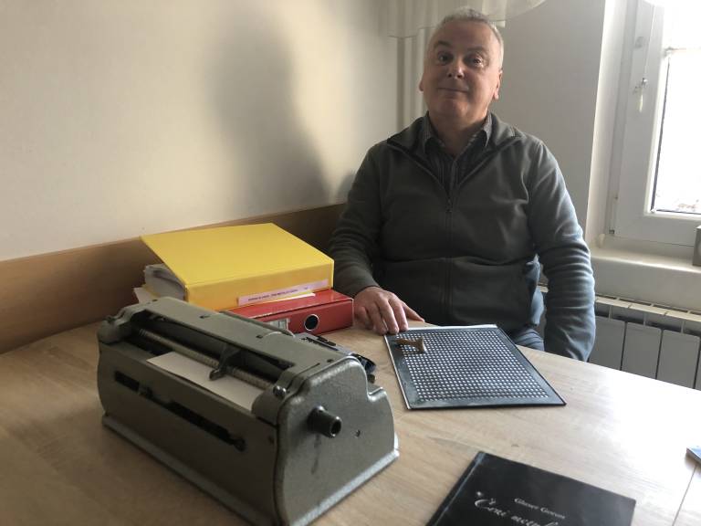 »Preden sem šel na šolanje so me vključili v Društvo slepih v Mariboru in takrat mi je takratni predsednik prinesel na dom abecednik, pač učenje brajeve pisave in tako tablico, na katero so me potem učili pisat,« pove.