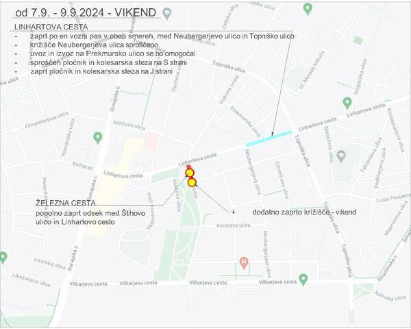 Od jutri pa do predvidoma ponedeljka pa bo za ves promet zaprta tudi Železna cesta, vključno s križiščem Štihove ulice in Železne ceste.