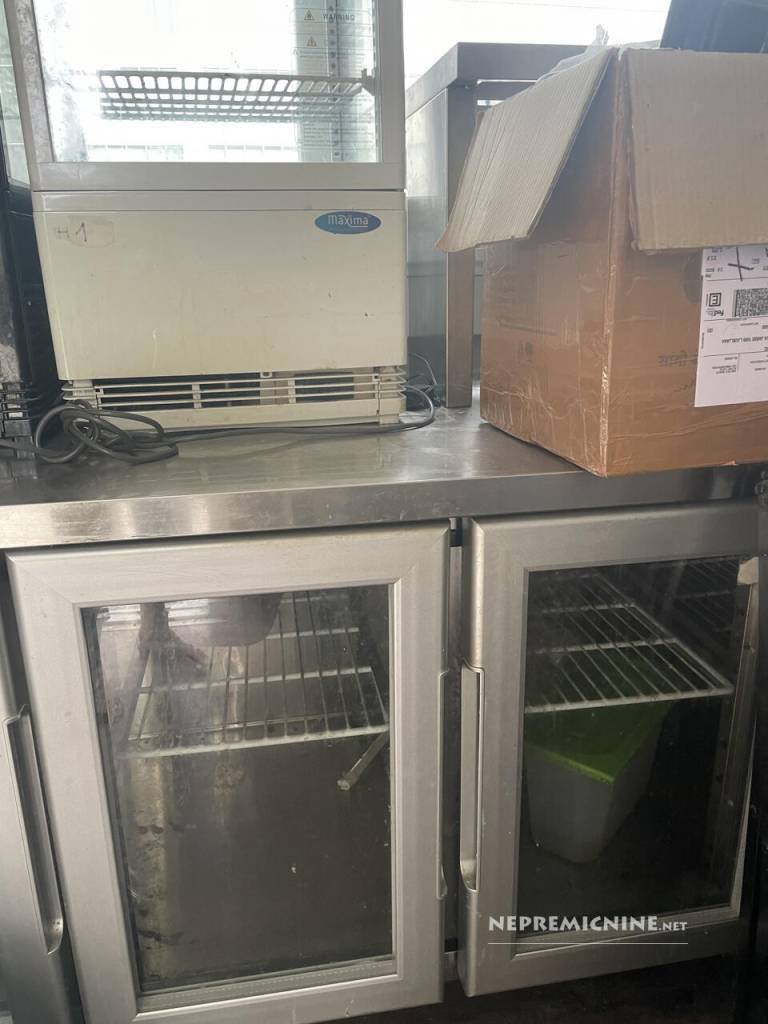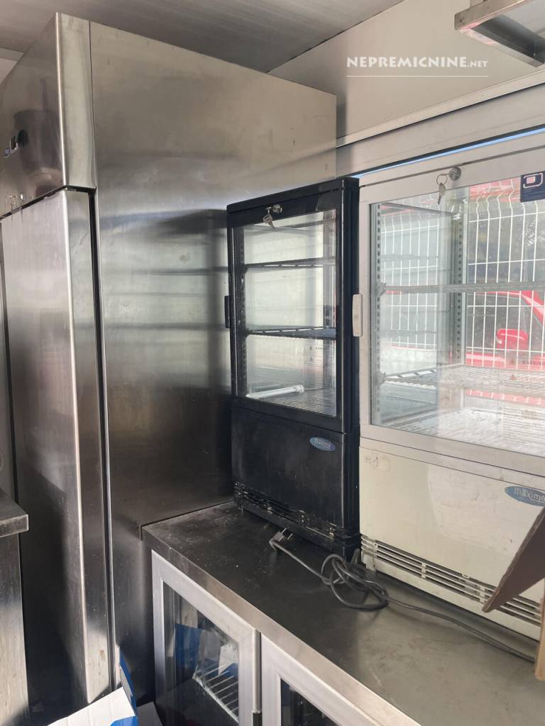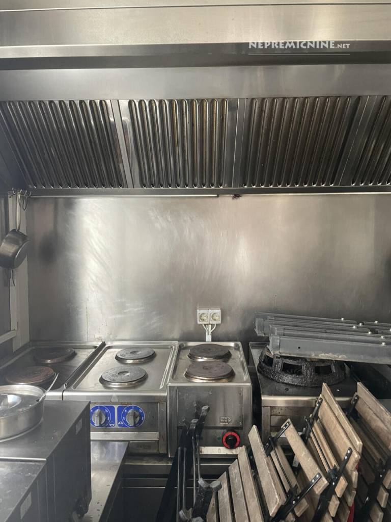 V njem so napa, več hladilnikov, cvrtniki, pulti, kuhalne plošče in plinski štedilnik.