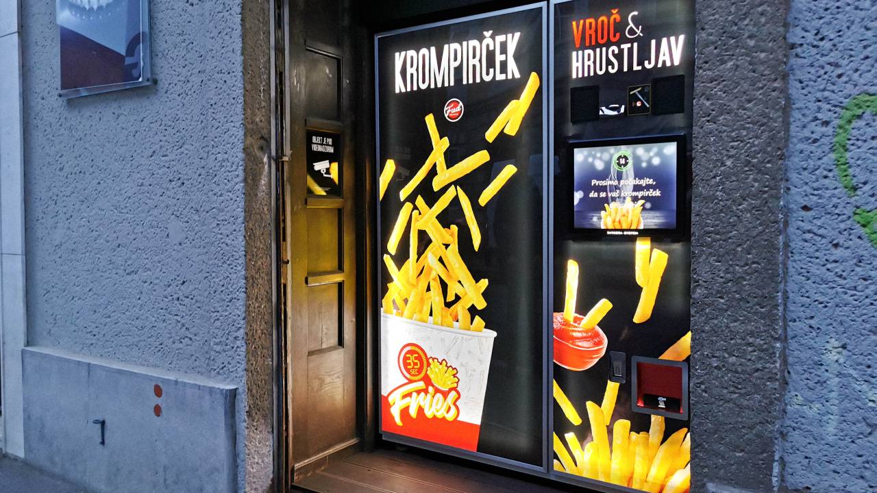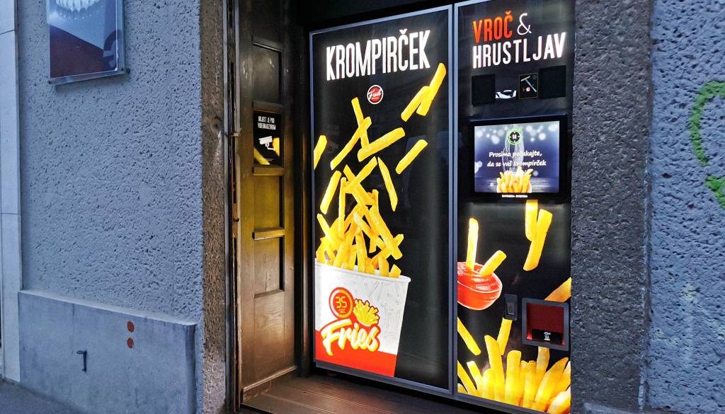 V Mariboru si lahko od lanskega aprila privoščimo hrustljavo zapečen krompirček kar iz avtomata. Le vstavimo denar, pritisnemo in gumb in počakamo na svojo porcijo 'pomfrija'. Trem avtomatom s krompirčkom, so se nato pridružili še pišek popsi.