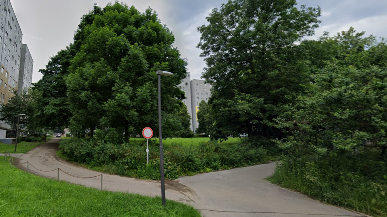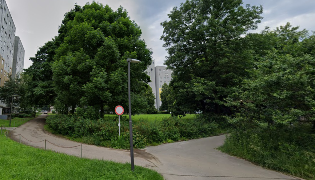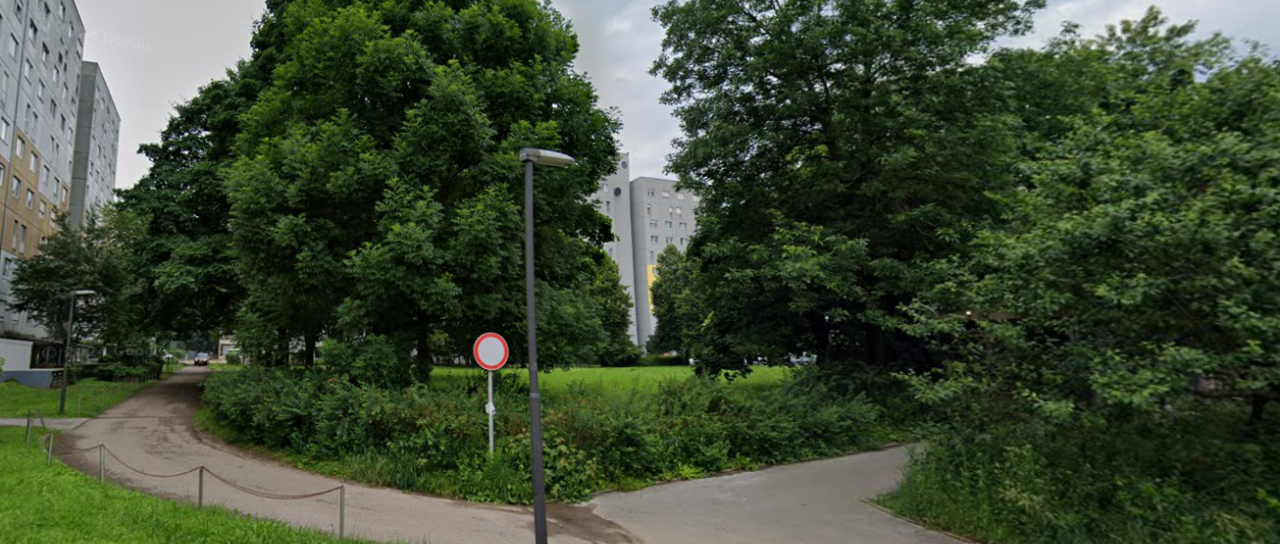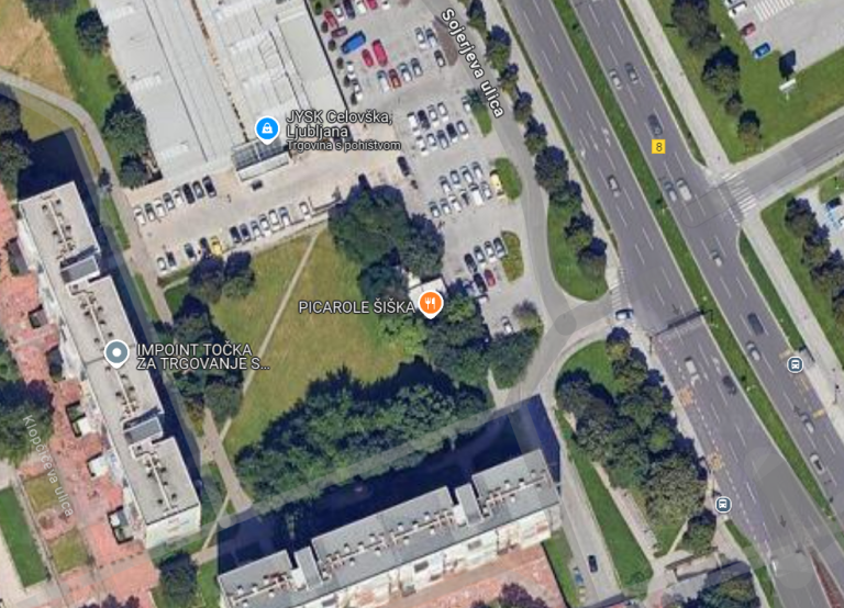 Zemljišče z dveh strani obdajajo stanovanjski bloki, z ene parkirišče, z druge pa trgovski center.