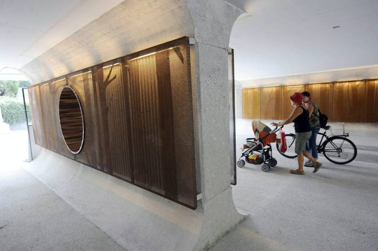 Okrogle praznine v stenah so obdali z orehovim lesom in omogočili ljudem prostor za postanek, počitek, branje knjige ali druženje.