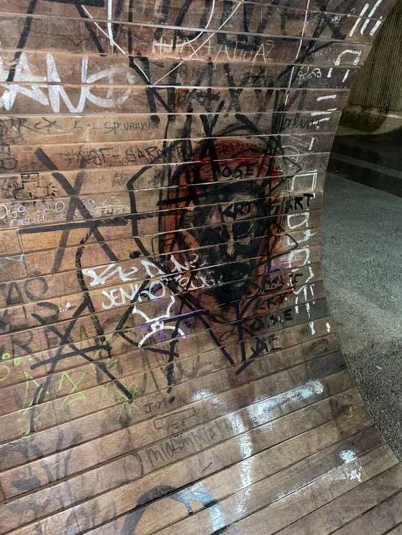 Grafitarji brez težav ustvarjajo na zaščitno mrežo, popisane so tudi lesene klopce oziroma z lesom obdane odprtine v steni.
