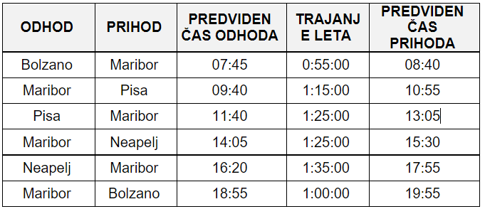 Povratna vozovnica z vključeno 15-kilogramsko oddano in osemkilogramsko kabinsko prtljago za Bolzano bo stala 259 evrov, za Piso 289, za Neapelj pa 359 evrov.