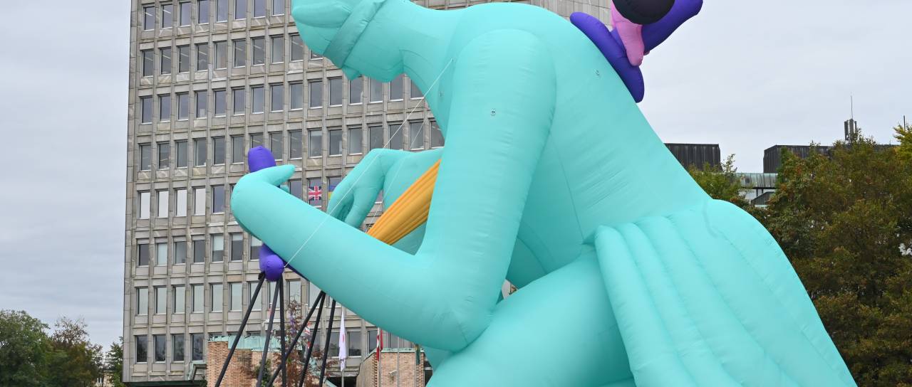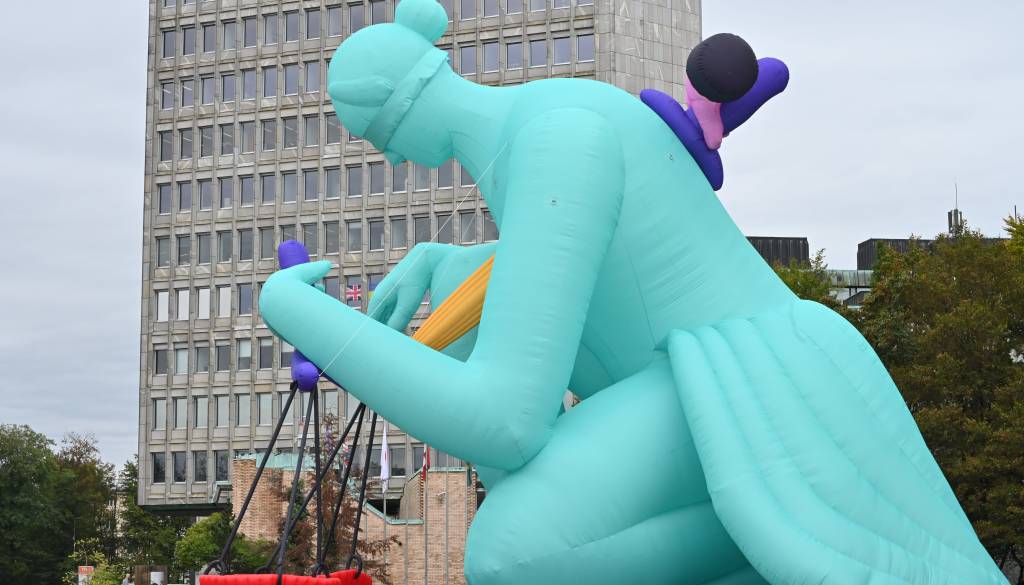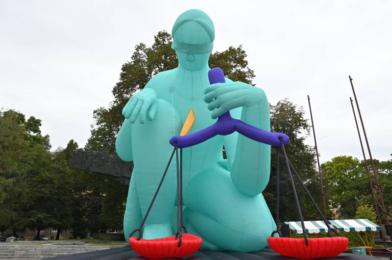 Aktivist Alban Grosdidier je v okviru turneje Pravica na obisku danes v središču Ljubljane z ogromnim balonom Lady Justice oziroma Gospa Pravica opozarjal na predlog evropske direktive, s katero bi podjetja v Evropski uniji odgovarjala za teptanje človekovih pravic.