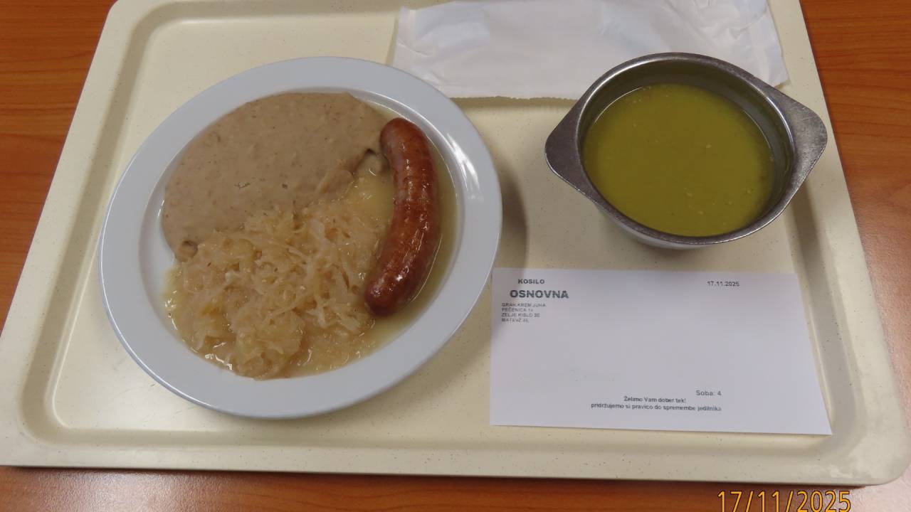 Predstavili so nam tudi enega zadnjih kosil. V ponedeljek so denimo za paciente Univerzitetnega kliničnega centra Ljubljana v osnovni dieti pripravili zelenjavno juho, kislo zelje, matevž in pečenico«.
