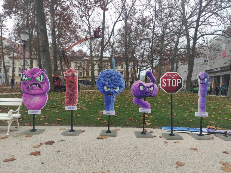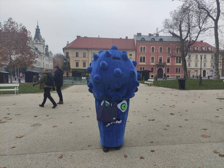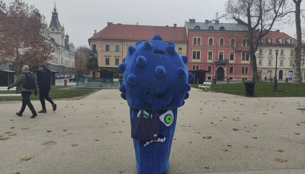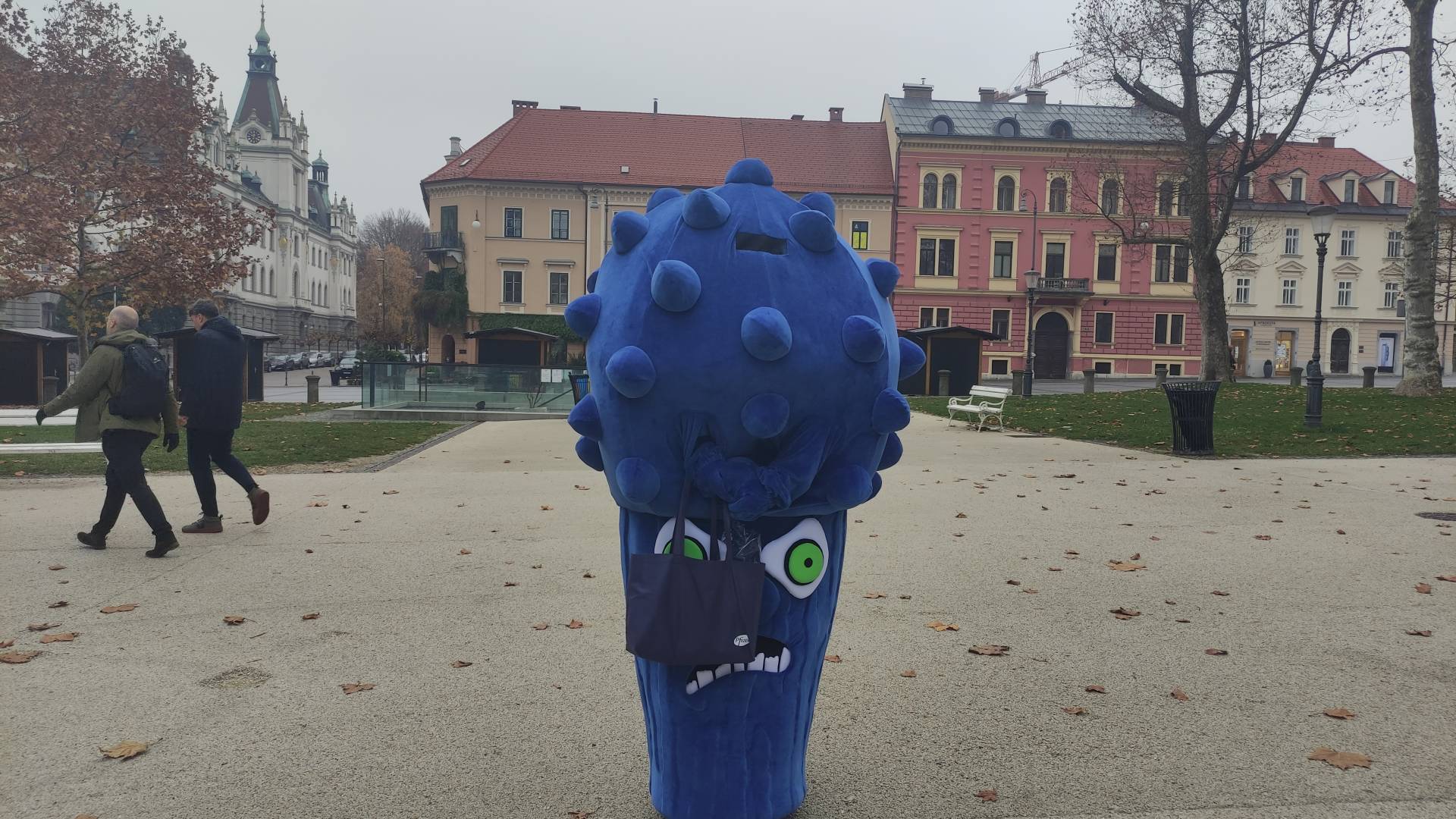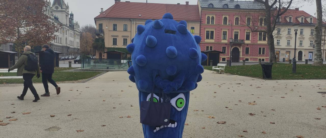 Ste opazili modro 'maskoto' v parku Zvezda? Predstavlja bakterijo, ki mimoidoče ozavešča o pravilnem jemanju antibiotikov.