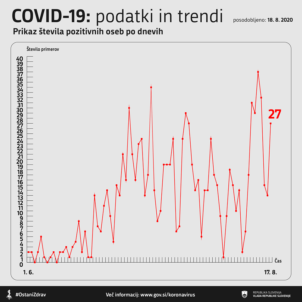 Včeraj, 17. avgusta 2020, so v Sloveniji opravili 1143 testiranj na novi koronavirus. Potrdili so 27 novih okužb s koronavirusom.
