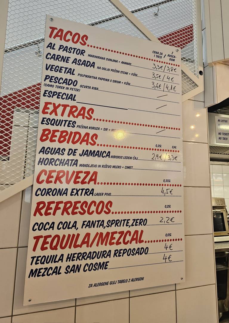 S cenika lahko razberemo, da se cene različnih tacosov gibljejo med 3,3 in 4,1 evra na kos, podobne pa so tudi cene sladkih ter alkoholnih pijač.